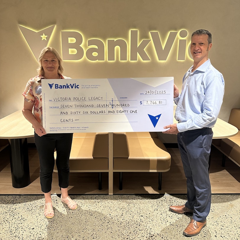 CEO Anthony De Fazio recently presented VPL CEO Debra Robertson with $7,766.81, which was donated by the community and BankVic team, and contributes to bringing some Christmas-time joy to children and families of police who are no longer with us.